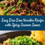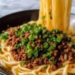 A flavorful and spicy Dan Dan Noodles recipe featuring tender ground pork, a savory sesame and chili sauce, and perfectly cooked wheat noodles. This dish is a classic Sichuan street food favorite with a delicious balance of spicy, salty, and slightly sweet flavors, garnished with crunchy peanuts and fresh green onions.