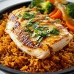 Baked Fish Rice is a delicious and healthy Mediterranean-inspired one-pan meal featuring tender white fish fillets baked on a bed of seasoned long-grain rice and vegetables. This easy oven-baked dish brings together simple ingredients like rice, broth, bell pepper, peas, and aromatic spices for a satisfying weeknight dinner that’s both wholesome and flavorful.