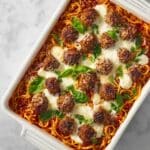 This Baked Spaghetti and Meatballs recipe combines tender homemade meatballs with perfectly cooked spaghetti and rich marinara sauce, all topped with melted mozzarella and Parmesan cheese. Baked to bubbly, golden perfection, this comforting casserole makes a hearty meal for family and friends in just under an hour.