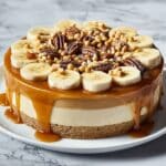 - Add Toppings and Serve: Once chilled, top the cheesecake with fresh banana slices, drizzle generously with caramel sauce, and sprinkle chopped walnuts or pecans evenly over the top. Slice and serve chilled for the best flavor and texture.