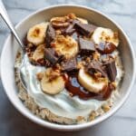 Here comes the fun part! Top each serving with the sliced banana, plenty of chopped dark chocolate, and a sprinkle of nuts if you’re using them. If you love a little flavor contrast, finish with a pinch of sea salt to bring out every nuance of the chocolate and banana.