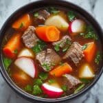 A hearty and comforting beef soup featuring tender chunks of beef stew meat simmered with carrots, radishes, and potatoes in a flavorful broth. This classic soup is perfect for a nourishing meal and easy to prepare with simple ingredients.