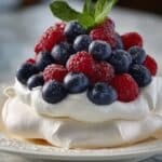 This Berry Pavlova with Whipped Cream is a light and elegant dessert featuring a crisp meringue base topped with fluffy whipped cream and fresh mixed berries. Perfect for special occasions or a refreshing treat, it combines a crunchy exterior with a soft, marshmallow-like center and vibrant berry flavors.