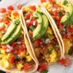- Assemble Tacos: Divide the scrambled eggs evenly among the warmed tortillas. Sprinkle each with shredded cheese and then top with cooked sausage or bacon, diced tomatoes, onions, chopped cilantro, sliced avocado, salsa, and hot sauce according to your taste preference.