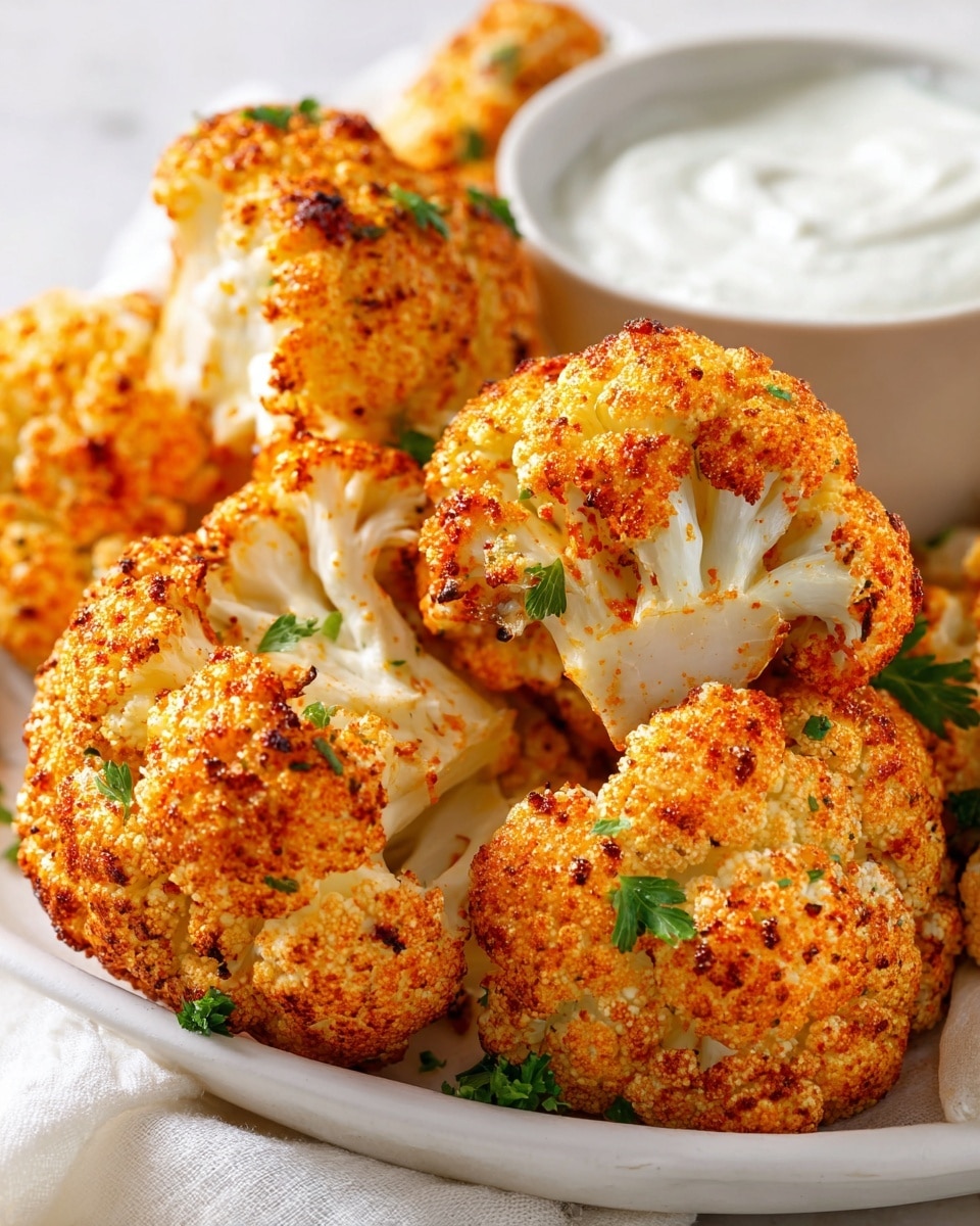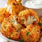 Crispy and flavorful Buffalo Cauliflower Bites roasted to perfection in the oven, tossed in spicy buffalo sauce, making a perfect appetizer or snack for any occasion.