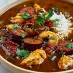 This Cajun Chicken and Sausage Gumbo is a rich and hearty Louisiana classic, featuring tender chicken, smoky andouille sausage, and a deeply flavorful roux-based broth thickened with okra and spiced with authentic Cajun seasonings. Served over fluffy white rice, it’s a comforting dish perfect for family dinners or entertaining guests.