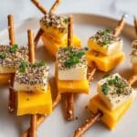 Cheddar Cubes Pretzel Sparklers are a fun and easy appetizer featuring sharp cheddar cheese cubes skewered onto pretzel sticks, garnished with fresh herbs or seeds, and accented with colorful grapes or cherry tomato halves. Perfect for parties and gatherings, these bite-sized treats combine savory, salty, and fresh flavors with an eye-catching presentation that’s ready in just 15 minutes.
