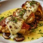 To finish, sprinkle freshly chopped parsley over the hot chicken for a burst of color and fresh flavor. Serve immediately so everyone can dig into the delightful mix of melty cheese, succulent mushrooms, and perfectly cooked chicken.