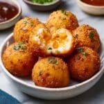 Delicious Italian Arancini are crispy fried risotto balls stuffed with gooey mozzarella and Parmesan cheese. This classic recipe features creamy Arborio rice slowly simmered in broth, mixed with fresh parsley and Parmesan, then coated in a crunchy panko breadcrumbs crust and deep fried to golden perfection. Perfect as an appetizer or a comforting snack.