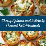 These Cheesy Spinach and Artichoke Pinwheels are a delicious and easy appetizer perfect for parties or snacks. Featuring a creamy mixture of artichoke hearts, spinach, and cheeses spread over flaky crescent roll dough, they bake into golden, savory pinwheels that are sure to impress your guests.