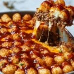 This Cheesy Tater Tot Meatloaf Casserole is a comforting, hearty dish combining savory ground beef meatloaf with crispy tater tots, tangy barbecue sauce, and a melty blend of mozzarella and cheddar cheeses. Perfect for a family dinner, it offers a fun twist on traditional meatloaf by layering flavorful components into a delicious casserole baked until golden and bubbly.