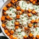 This Cheesy Turkey and Sweet Potato Skillet is a wholesome and flavorful one-pan meal, featuring lean ground turkey, tender sweet potatoes, and gooey melted mozzarella cheese. Perfect for a quick weeknight dinner, this recipe combines savory and slightly sweet elements with optional spicy chili flakes and fresh parsley for garnish.