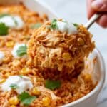 Once baked, garnish your Chicken Enchilada Rice Casserole Recipe with freshly chopped cilantro or parsley. This bright, fresh note adds a beautiful contrast to the rich, cheesy casserole and makes your presentation pop.