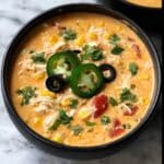 This version of Chicken Enchilada Soup Recipe is medium-thick, creamy but still spoonable. If you like it thinner, simply add more chicken broth when reheating or cooking. For a thicker soup, let it simmer uncovered to reduce the liquid.