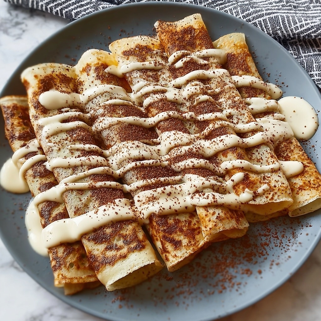 Spread a generous layer of the cinnamon filling over each crepe, then carefully roll them up like a scroll. Finally, drizzle with your luscious cream cheese sauce for a beautiful finish that brings the whole dish together. Serve immediately and enjoy every cozy bite.
