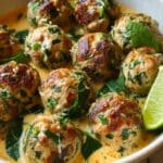 - Prepare the sauce and cook meatballs: In the same skillet, whisk together coconut milk, red curry paste, lime juice, honey (or maple syrup), and fish sauce or soy sauce if using. Bring the mixture to a simmer. Return the browned meatballs to the pan, cover, and cook for 8 to 10 minutes until the meatballs are fully cooked through and the sauce has thickened slightly.