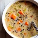 This Cozy Autumn Wild Rice Soup Recipe is somewhere between a hearty stew and a creamy soup. It’s rich and filling but still silky enough to enjoy as a soothing bowl of comfort.