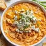 You can freeze leftover Creamy Buffalo Chicken Dip Recipe for up to 2 months. Just make sure it’s fully cooled before transferring to a freezer-safe dish or bag. Thaw it overnight in the fridge before reheating.