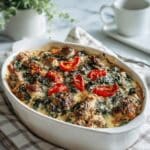 This Creamy Chicken and Veggie Casserole is a comforting and nutritious dish featuring tender chicken breast, sautéed vegetables, and a creamy mushroom sauce, baked to perfection. Ideal for a hearty family meal, it blends spinach, bell peppers, mushrooms, and a light dairy-based sauce in a quick 50-minute recipe.