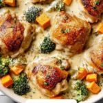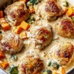 This Creamy Garlic Chicken & Vegetables recipe features tender chicken thighs or breasts cooked in a rich, garlicky cream sauce paired with roasted broccoli and butternut squash. It’s a comforting, balanced one-pan meal perfect for a cozy dinner, combining vibrant roasted vegetables with savory chicken in a buttery garlic sauce.