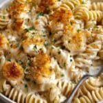 Creamy Garlic Parmesan Chicken Pasta Bake is a comforting and flavorful casserole featuring tender rotini pasta, juicy cooked chicken, and rich Alfredo and garlic Parmesan sauces. Topped with a blend of mozzarella and Parmesan cheeses, baked to bubbly perfection with a golden, crispy finish, this dish makes a perfect weeknight dinner for the whole family.