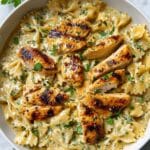 Drain the pasta, reserving about ¼ cup of the pasta water. Toss the farfalle into the creamy sauce, adding reserved pasta water a little at a time to get that perfect coating consistency. Slice the rested chicken and gently fold it into the pasta. This final step brings everything together for a harmonious plate of rich creaminess and seasoned chicken bliss.