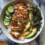 Slice your crispy chicken into strips and create beautiful bowls by layering cooked rice, the sliced chicken, edamame, cucumber, avocado, pickled ginger, green onions, and torn nori sheets. Drizzle generously with spicy mayo and the reserved marinade sauce for bursts of savory goodness throughout.