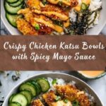 This Crispy Chicken Katsu Bowl features perfectly breaded and fried chicken cutlets served over fluffy jasmine or sushi rice, accompanied by sautéed edamame, fresh cucumber, avocado, pickled ginger, and garnished with nori and green onions. A delicious homemade spicy mayo and a savory marinade sauce round out this flavorful and colorful Japanese-inspired meal, perfect for a satisfying dinner.