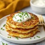 - Garnish and Serve: Once cooked, transfer the pancakes to a plate lined with paper towels to drain any excess oil. Serve warm, optionally topped with sour cream and chopped green onions or chives for extra flavor and presentation.