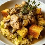 For a delightful presentation, serve this Crock Pot Chicken and Dressing Recipe in rustic, shallow casserole dishes or individual ramekins. Layer the chicken and stuffing in clear baking dishes for a stunning visual that highlights the golden top and moist interior, perfect for sharing at the table.