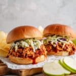 Keep leftover pulled chicken in an airtight container in the refrigerator for up to 4 days. The sauce helps maintain moisture, ensuring that reheated sandwiches taste almost as good as fresh.