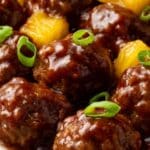 Delicious and easy Crockpot Sweet and Sour Meatballs cooked low and slow with pineapple, honey, soy sauce, and a tangy vinegar kick. Perfect for a comforting weeknight dinner, these meatballs are coated in a thick, flavorful sauce and can be served over white rice with a fresh garnish of green onions.