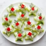 These Cucumber Dill Christmas Stars are a festive and refreshing appetizer perfect for holiday gatherings. Thinly sliced cucumbers are cut into charming star shapes, topped with a creamy dill-infused cheese mixture, and garnished with colorful red bell pepper and fresh dill sprigs. Light, elegant, and easy to prepare, they make a delightful addition to any party platter.