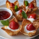 Delight in these crispy Deep-Fried Strawberry Cheesecake Stuffed Wonton Bites, featuring a creamy cheesecake filling with a burst of strawberry jam, all enveloped in a golden fried wonton wrapper. Perfect as a sweet appetizer or dessert, these bites are served with whipped cream and fresh strawberries for an irresistible treat.