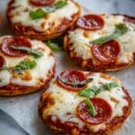 These Delicious Pepperoni Mini Pizzas are a quick and easy snack or meal perfect for any time of day. Made with pita bread or English muffins as the base, topped with savory pizza sauce, melted mozzarella cheese, flavorful pepperoni slices, and a sprinkle of Italian seasoning, they’re sure to satisfy pizza cravings in just 22 minutes.