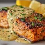 This Dijon Salmon with Lemon Dijon Sauce is a flavorful and healthy main course featuring tender salmon fillets seared and baked to perfection, then topped with a creamy, tangy lemon dijon sauce. The sauce combines Dijon mustard, fresh lemon juice and zest, garlic, honey, and cream for a perfect balance of zest and richness. Garnished with fresh parsley, this easy-to-make recipe is perfect for a nutritious dinner paired with roasted vegetables or rice.