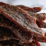 The jerky is done when it feels firm but still slightly pliable. Bending a strip should cause a little crack without breaking it outright. This texture means it has retained moisture enough for chewiness while being dry enough to store safely.
