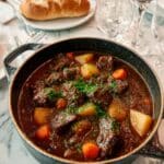For an elegant touch, serve the stew in individual ramekins topped with a sprig of thyme or a swirl of crème fraîche. Another fun idea is to fill hollowed-out French bread bowls with the stew, offering an edible, flavorful container that delights guests visually and taste-wise.