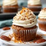 - Frost the cupcakes: Once the cupcakes have fully cooled, frost each generously with the cream cheese frosting. Garnish with coarsely chopped pecans if desired for an extra crunchy texture and nutty flavor.
