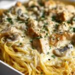 This Easy Chicken Tetrazzini is a comforting American casserole featuring tender shredded chicken, sautéed mushrooms, and creamy cheese sauce tossed with spaghetti, then baked to golden perfection. A perfect family-friendly meal that’s simple to prepare and packed with rich flavors.