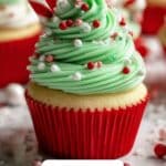 These Easy Christmas Cupcakes are festive vanilla-flavored treats perfect for holiday celebrations. Moist cupcakes are topped with vibrant green buttercream frosting and decorated with candy canes, sprinkles, and edible snowflakes for a merry and bright presentation.