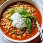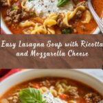 This Easy Lasagna Soup combines all the comforting flavors of classic lasagna in a hearty, cozy soup form. Made with ground beef or Italian sausage, tomatoes, herbs, and broken lasagna noodles, it’s topped with creamy ricotta and melted mozzarella cheese for an irresistible meal ready in just 40 minutes.