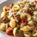 This Easy Orecchiette Pasta with Sausage is a flavorful Italian main course featuring tender ear-shaped pasta, savory Italian sausage, fresh spinach, and a hint of spice from red pepper flakes. Cooked entirely on the stovetop, it combines protein, greens, and a touch of Parmesan for a satisfying, quick, and comforting meal perfect for weeknights.