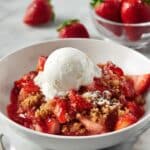 4. Assemble and Bake: Sprinkle the crumble topping evenly over the strawberry filling in the baking dish. Place the dish in the preheated oven and bake for 35 to 40 minutes, or until the topping turns golden brown and the strawberries are bubbling nicely.