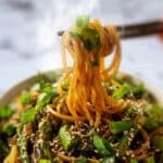 - Serve and Garnish: Plate the noodles immediately, garnishing with chopped roasted peanuts, extra sliced green onions, and cucumber matchsticks for freshness and crunch.