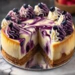 This Elegant White Chocolate Blueberry Swirl Cheesecake features a buttery graham cracker crust with a creamy white chocolate and cream cheese filling, beautifully marbled with a fresh blueberry swirl. Perfect for special occasions, this cheesecake combines rich textures and bright berry flavors for a stunning dessert.