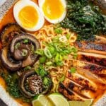 Ladle the piping hot ramen into bowls, then top each with halved boiled eggs, sliced green onions, and a sprinkle of toasted sesame seeds. Finally, squeeze fresh lime wedges over the bowl right before eating to brighten the rich, spicy flavors with a burst of citrusy freshness.