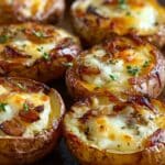 These French Onion Baked Potatoes combine crispy, oven-baked russet potatoes with a rich and creamy French onion sauce topped with melted Gruyère and cheddar cheese. Caramelized onions simmered in beef broth and cream create a decadent topping that transforms simple baked potatoes into an elegant and satisfying meal or side dish.