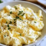 When your eggs are just barely set and still soft like a custard, remove the pan from the heat. If you’re using heavy cream, stir it in now—it adds an extra layer of silkiness. Season generously with salt and freshly ground black pepper, taste, and adjust as needed. Serve immediately for the best experience.