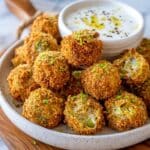 Crispy fried green olives coated in a Parmesan panko crust served with a zesty garlic aioli, perfect as a savory appetizer or snack.